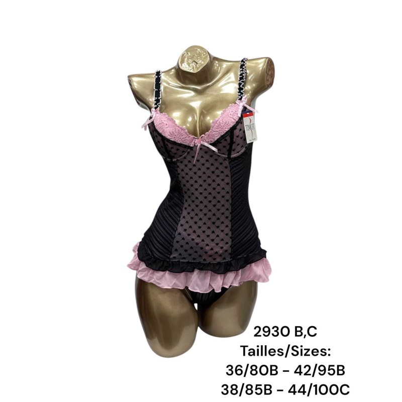 Chaque ensemble comprend une nuisette et un string coordonné, emballés individuellement pour une présentation soignée en boutique ou en ligne.